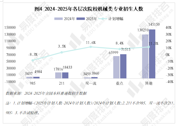 取专业点新增数量一样,以更大的体量支持机械类招生总规模的抬升。其他各条理院校则有3%-12%的涨幅,